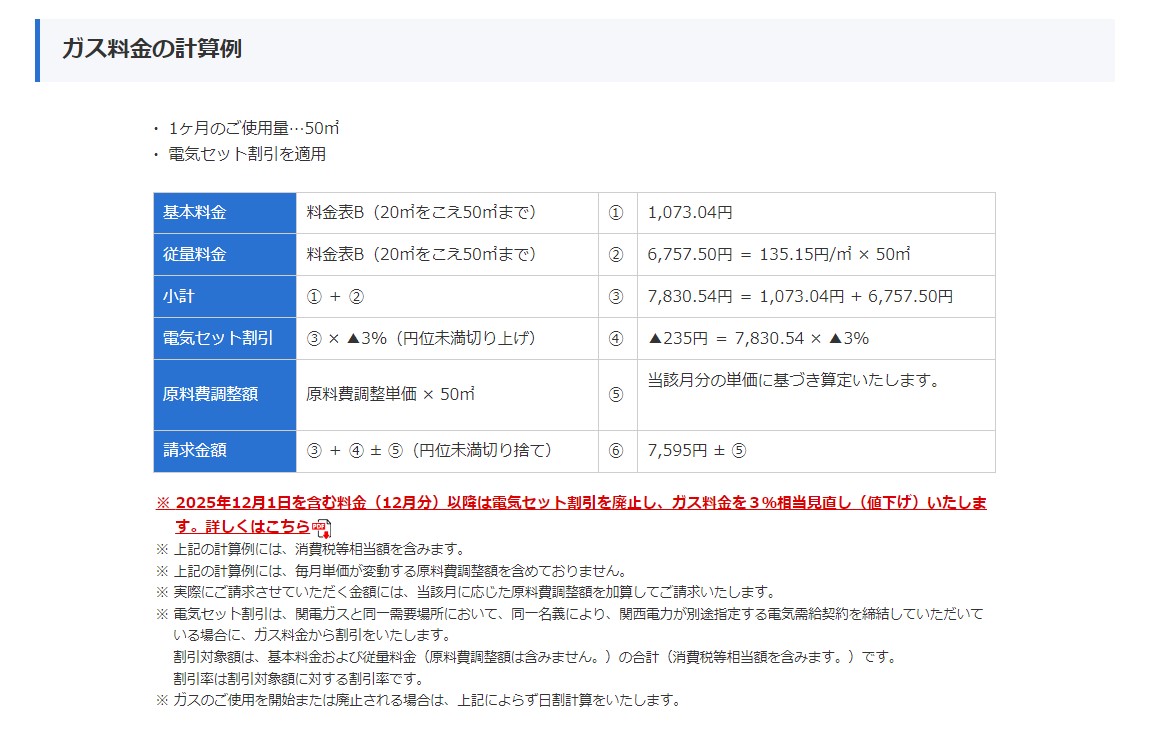 2025年11月30日までのご使用期間のガス料金の計算例はこちらでご確認いただけます。